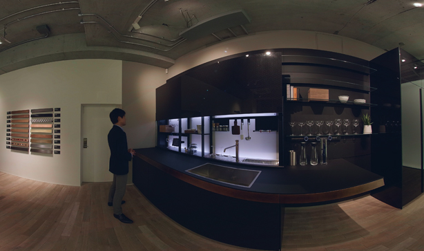 イタリアのプレミアムキッチンブランド Valcucine(バルクッチーネ)の専用ショールーム「Valcucine Tokyo」のVRコンテンツ。空間トーンを活かしたVR映像に仕上げるため、超広角魚眼レンズをつけたミラーレス一眼で撮影し、制作しました。販促イベント等での集客・予約促進にご活用いただいております。